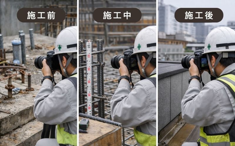 特に、鉄筋や下地処理などの施工後に見えなくなる隠蔽部は必ず写真を残すことが基本です。また、施工前・施工中・施工後の流れで撮影することで、工事全体の記録を分かりやすく残すことができます。