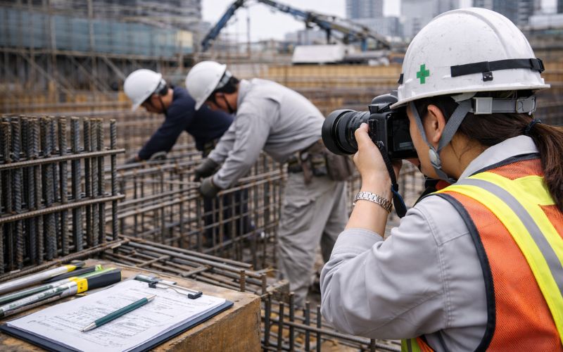そして最も重要な考え方が隠蔽部の記録です。鉄筋はコンクリート打設後に完全に見えなくなるため、施工中の状態を写真として残しておかなければ後から確認することができません。だからこそ鉄筋工事では、「後から確認できない部分ほど確実に撮影する」という意識が重要になります。適切な写真を残しておくことで、施工品質を証明し、検査やトラブル時にも対応できる記録を残すことができます。
