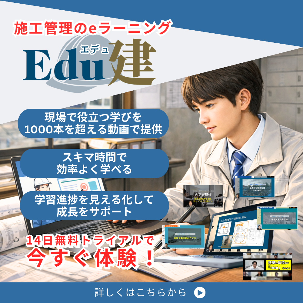 施工管理のeラーニングEdu建では、施工管理に特化し、動画+実務を前提にした教育コンテンツを提供しています。ただ理解するだけで終わらず、現場で使える力に変えることにフォーカスしています。