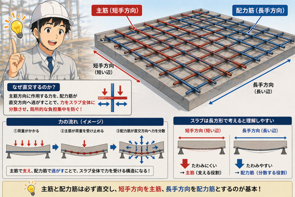 主筋と配力筋は、必ず直交(90度)する関係で配置されます。その理由は、力を効率よく分散させるためです。