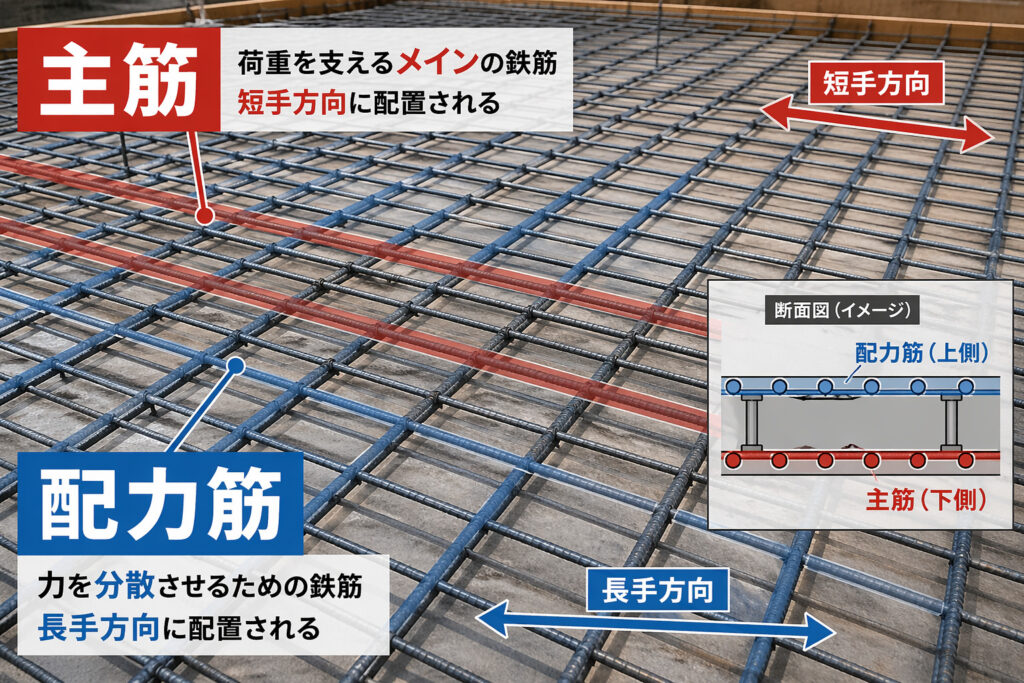 - 短手方向:たわみにくい → 主筋(支える役割)
