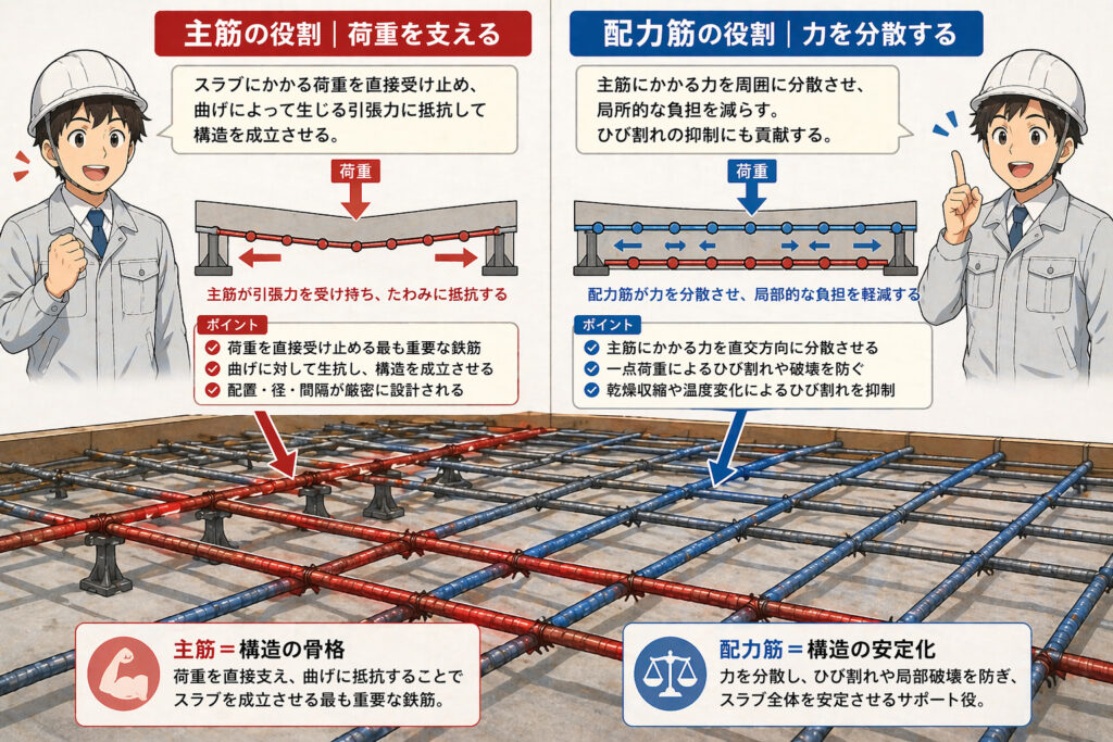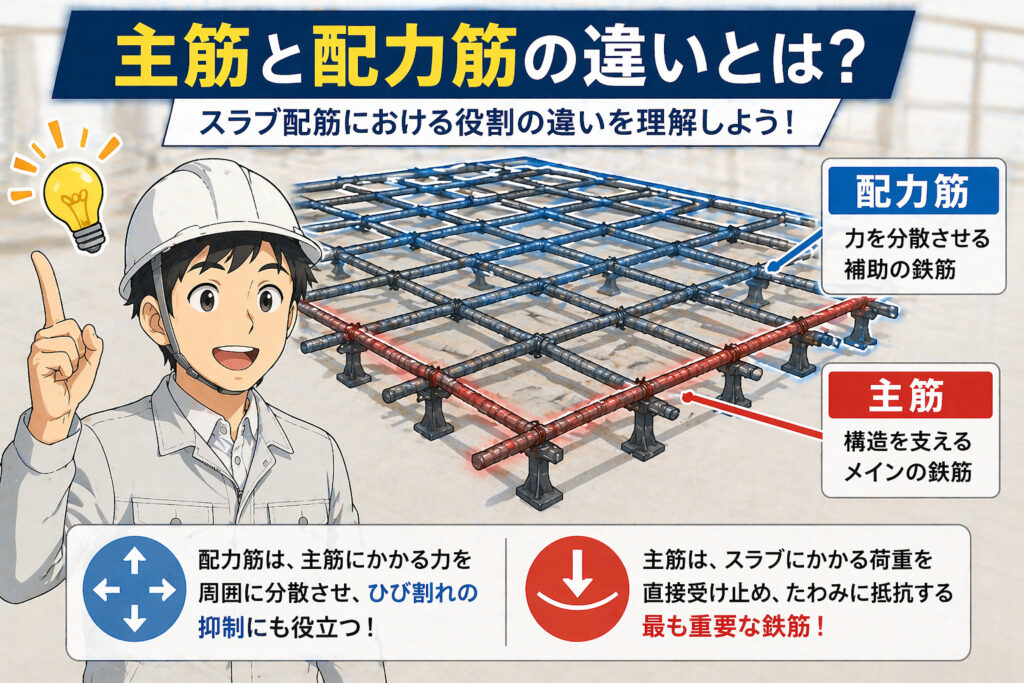 スラブ配筋における主筋と配力筋の違いは、単なる名称の違いではなく、「構造を成立させる役割」と「それを補助する役割」という明確な機能の違いがあります。この2つの役割を正しく理解していないと、配筋の意味が分からず、現場でのチェックも“ただの確認作業”になってしまいます。